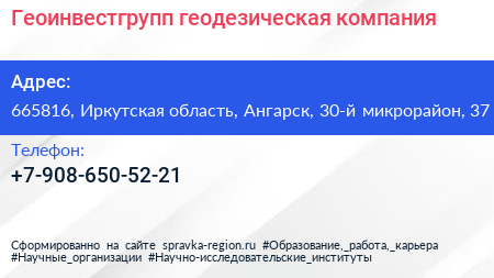 Геоинвестгрупп, геодезическая компания по адресу 665816, Иркутская область, Ангарск, 30-й микрорайон, 37 в дальнейшем Организация, размещена в следующих категориях: