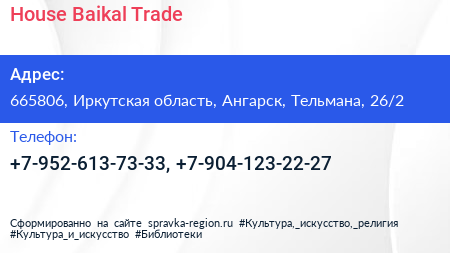 House Baikal Trade по адресу 665806, Иркутская область, Ангарск, Тельмана, 26/2 в дальнейшем Организация, размещена в следующих категориях: