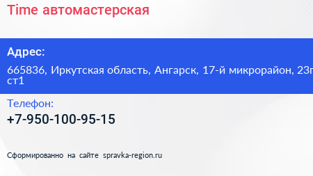 Time, автомастерская по адресу 665836, Иркутская область, Ангарск, 17-й микрорайон, 23г ст1 в дальнейшем Организация, размещена в следующих категориях: