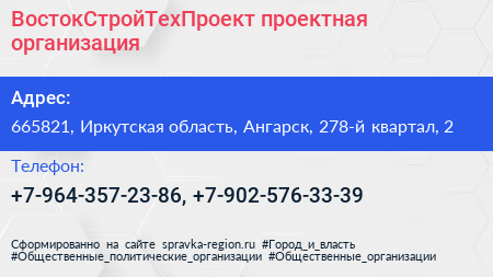 ВостокСтройТехПроект, проектная организация по адресу 665821, Иркутская область, Ангарск, 278-й квартал, 2 в дальнейшем Организация, размещена в следующих категориях: