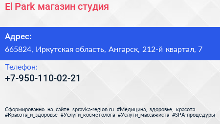 El Park, магазин-студия по адресу 665824, Иркутская область, Ангарск, 212-й квартал, 7 в дальнейшем Организация, размещена в следующих категориях: