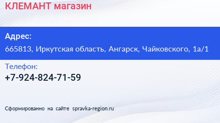 КЛЕМАНТ, магазин по адресу 665813, Иркутская область, Ангарск, Чайковского, 1а/1 в дальнейшем Организация, размещена в следующих категориях: