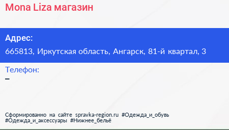 Mona Liza, магазин по адресу 665813, Иркутская область, Ангарск, 81-й квартал, 3 в дальнейшем Организация, размещена в следующих категориях: