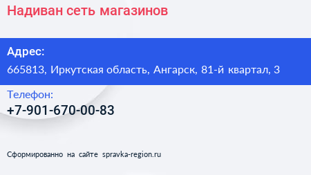 Надиван, сеть магазинов по адресу 665813, Иркутская область, Ангарск, 81-й квартал, 3 в дальнейшем Организация, размещена в следующих категориях:
