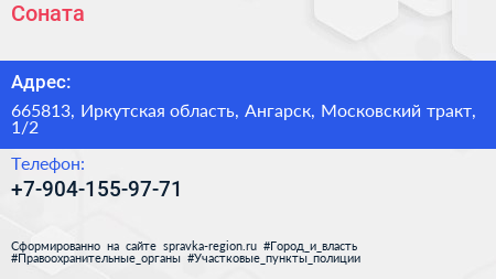 Соната+ по адресу 665813, Иркутская область, Ангарск, Московский тракт, 1/2 в дальнейшем Организация, размещена в следующих категориях: