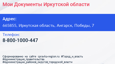 Мои Документы Иркутской области по адресу 665855, Иркутская область, Ангарск, Победы, 7 в дальнейшем Организация, размещена в следующих категориях: