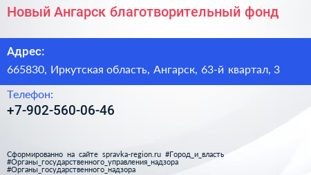 Новый Ангарск, благотворительный фонд по адресу 665830, Иркутская область, Ангарск, 63-й квартал, 3 в дальнейшем Организация, размещена в следующих категориях: