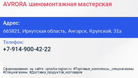 AVRORA, шиномонтажная мастерская по адресу 665821, Иркутская область, Ангарск, Крупской, 31а в дальнейшем Организация, размещена в следующих категориях: