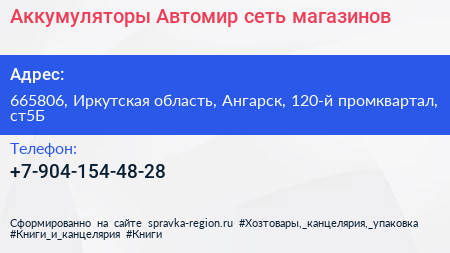 Аккумуляторы Автомир, сеть магазинов по адресу 665806, Иркутская область, Ангарск, 120-й промквартал, ст5Б в дальнейшем Организация, размещена в следующих категориях: