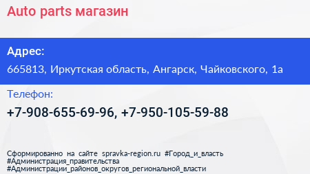 Auto parts, магазин по адресу 665813, Иркутская область, Ангарск, Чайковского, 1а в дальнейшем Организация, размещена в следующих категориях: