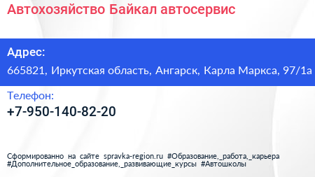 Автохозяйство Байкал, автосервис по адресу 665821, Иркутская область, Ангарск, Карла Маркса, 97/1а в дальнейшем Организация, размещена в следующих категориях: