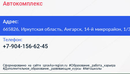 Автокомплекс по адресу 665826, Иркутская область, Ангарск, 14-й микрорайон, 1/3 в дальнейшем Организация, размещена в следующих категориях: