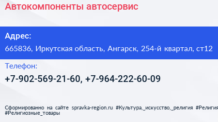 Автокомпоненты, автосервис по адресу 665836, Иркутская область, Ангарск, 254-й квартал, ст12 в дальнейшем Организация, размещена в следующих категориях:
