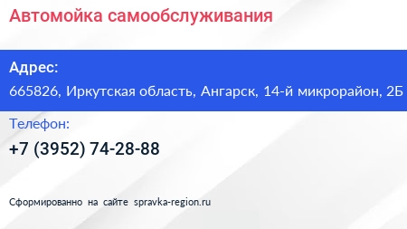 Автомойка самообслуживания по адресу 665826, Иркутская область, Ангарск, 14-й микрорайон, 2Б в дальнейшем Организация, размещена в следующих категориях: