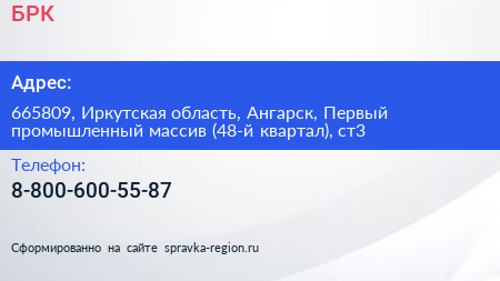 БРК по адресу 665809, Иркутская область, Ангарск, Первый промышленный массив (48-й квартал), ст3 в дальнейшем Организация, размещена в следующих категориях: