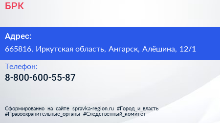 БРК по адресу 665816, Иркутская область, Ангарск, Алёшина, 12/1 в дальнейшем Организация, размещена в следующих категориях: