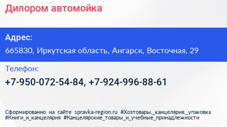 Дилором, автомойка по адресу 665830, Иркутская область, Ангарск, Восточная, 29 в дальнейшем Организация, размещена в следующих категориях: