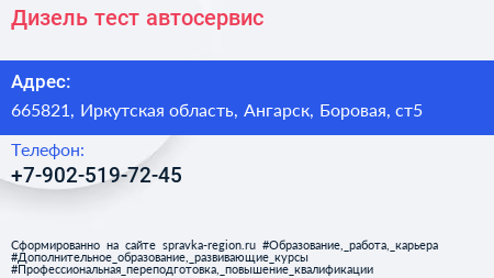 Дизель-тест, автосервис по адресу 665821, Иркутская область, Ангарск, Боровая, ст5 в дальнейшем Организация, размещена в следующих категориях: