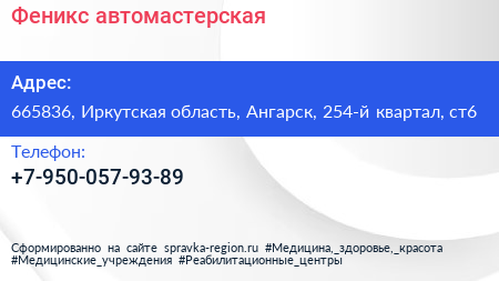 Феникс, автомастерская по адресу 665836, Иркутская область, Ангарск, 254-й квартал, ст6 в дальнейшем Организация, размещена в следующих категориях: