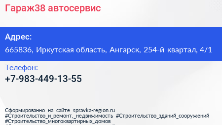 Гараж38, автосервис по адресу 665836, Иркутская область, Ангарск, 254-й квартал, 4/1 в дальнейшем Организация, размещена в следующих категориях: