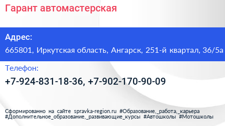 Гарант, автомастерская по адресу 665801, Иркутская область, Ангарск, 251-й квартал, 36/5а в дальнейшем Организация, размещена в следующих категориях: