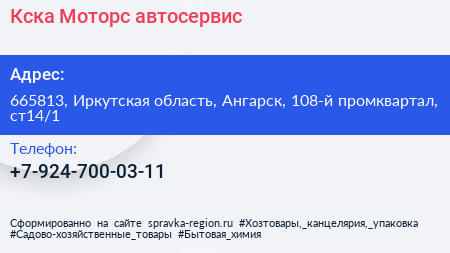 Кска Моторс, автосервис по адресу 665813, Иркутская область, Ангарск, 108-й промквартал, ст14/1 в дальнейшем Организация, размещена в следующих категориях: