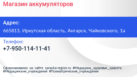Магазин аккумуляторов по адресу 665813, Иркутская область, Ангарск, Чайковского, 1а в дальнейшем Организация, размещена в следующих категориях: