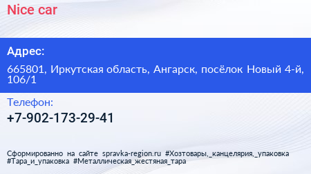 Nice car по адресу 665801, Иркутская область, Ангарск, посёлок Новый 4-й, 106/1 в дальнейшем Организация, размещена в следующих категориях: