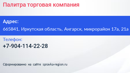 Палитра, торговая компания по адресу 665841, Иркутская область, Ангарск, микрорайон 17а, 21а в дальнейшем Организация, размещена в следующих категориях:
