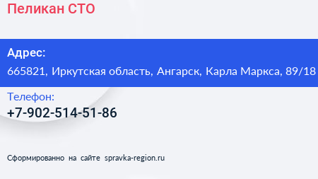 Пеликан, СТО по адресу 665821, Иркутская область, Ангарск, Карла Маркса, 89/18 в дальнейшем Организация, размещена в следующих категориях: