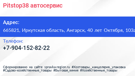 Pitstop38, автосервис по адресу 665821, Иркутская область, Ангарск, 40 лет Октября, 103а в дальнейшем Организация, размещена в следующих категориях: