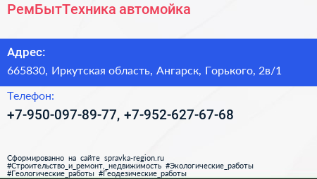 РемБытТехника, автомойка по адресу 665830, Иркутская область, Ангарск, Горького, 2в/1 в дальнейшем Организация, размещена в следующих категориях: