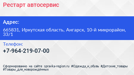 Рестарт, автосервис по адресу 665831, Иркутская область, Ангарск, 10-й микрорайон, 33/1 в дальнейшем Организация, размещена в следующих категориях: