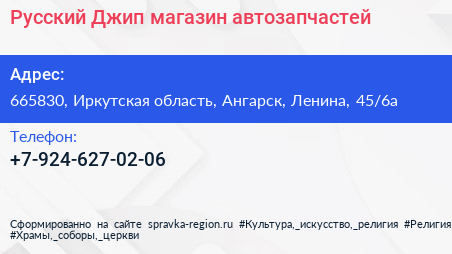Русский Джип, магазин автозапчастей по адресу 665830, Иркутская область, Ангарск, Ленина, 45/6а в дальнейшем Организация, размещена в следующих категориях: