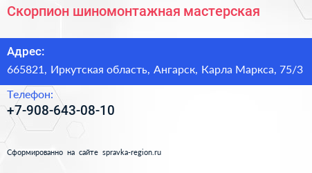 Скорпион, шиномонтажная мастерская по адресу 665821, Иркутская область, Ангарск, Карла Маркса, 75/3 в дальнейшем Организация, размещена в следующих категориях: