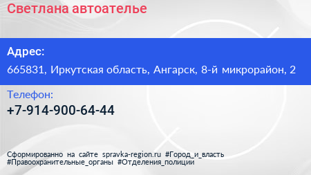Светлана, автоателье по адресу 665831, Иркутская область, Ангарск, 8-й микрорайон, 2 в дальнейшем Организация, размещена в следующих категориях: