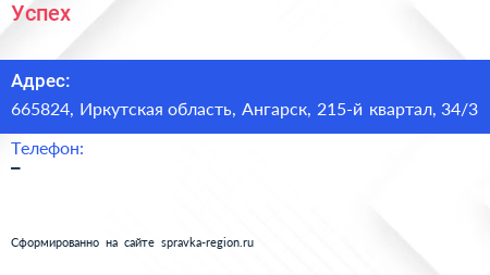 Успех по адресу 665824, Иркутская область, Ангарск, 215-й квартал, 34/3 в дальнейшем Организация, размещена в следующих категориях: