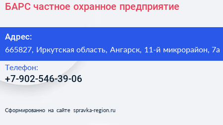 БАРС, частное охранное предприятие по адресу 665827, Иркутская область, Ангарск, 11-й микрорайон, 7а в дальнейшем Организация, размещена в следующих категориях: