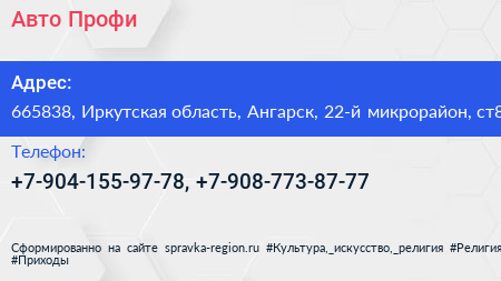 Авто-Профи по адресу 665838, Иркутская область, Ангарск, 22-й микрорайон, ст8 в дальнейшем Организация, размещена в следующих категориях: