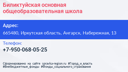 Биликтуйская основная общеобразовательная школа по адресу 665480, Иркутская область, Ангарск, Набережная, 13 в дальнейшем Организация, размещена в следующих категориях: