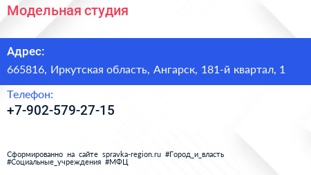 Модельная студия по адресу 665816, Иркутская область, Ангарск, 181-й квартал, 1 в дальнейшем Организация, размещена в следующих категориях: