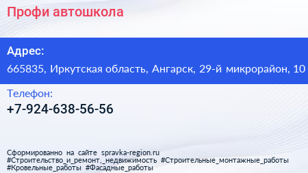 Профи, автошкола по адресу 665835, Иркутская область, Ангарск, 29-й микрорайон, 10 в дальнейшем Организация, размещена в следующих категориях: