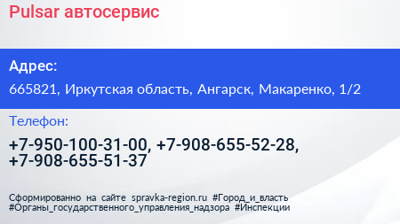 Pulsar, автосервис по адресу 665821, Иркутская область, Ангарск, Макаренко, 1/2 в дальнейшем Организация, размещена в следующих категориях: