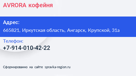 AVRORA, кофейня по адресу 665821, Иркутская область, Ангарск, Крупской, 31а в дальнейшем Организация, размещена в следующих категориях: