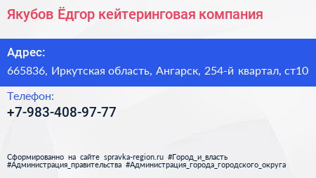 Якубов Ёдгор, кейтеринговая компания по адресу 665836, Иркутская область, Ангарск, 254-й квартал, ст10 в дальнейшем Организация, размещена в следующих категориях: