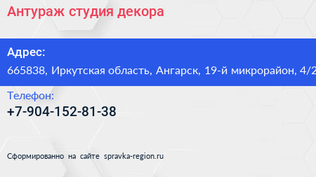 Антураж, студия декора по адресу 665838, Иркутская область, Ангарск, 19-й микрорайон, 4/2 в дальнейшем Организация, размещена в следующих категориях:
