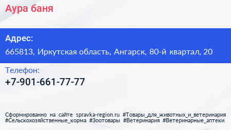 Аура, баня по адресу 665813, Иркутская область, Ангарск, 80-й квартал, 20 в дальнейшем Организация, размещена в следующих категориях: