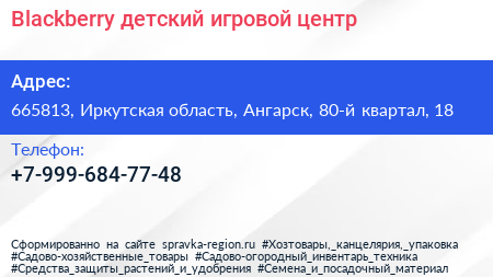 Blackberry, детский игровой центр по адресу 665813, Иркутская область, Ангарск, 80-й квартал, 18 в дальнейшем Организация, размещена в следующих категориях: