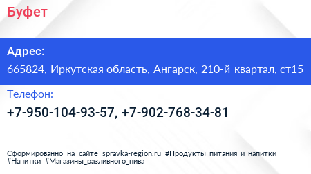 Буфет по адресу 665824, Иркутская область, Ангарск, 210-й квартал, ст15 в дальнейшем Организация, размещена в следующих категориях: