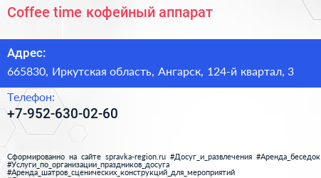 Coffee time, кофейный аппарат по адресу 665830, Иркутская область, Ангарск, 124-й квартал, 3 в дальнейшем Организация, размещена в следующих категориях: